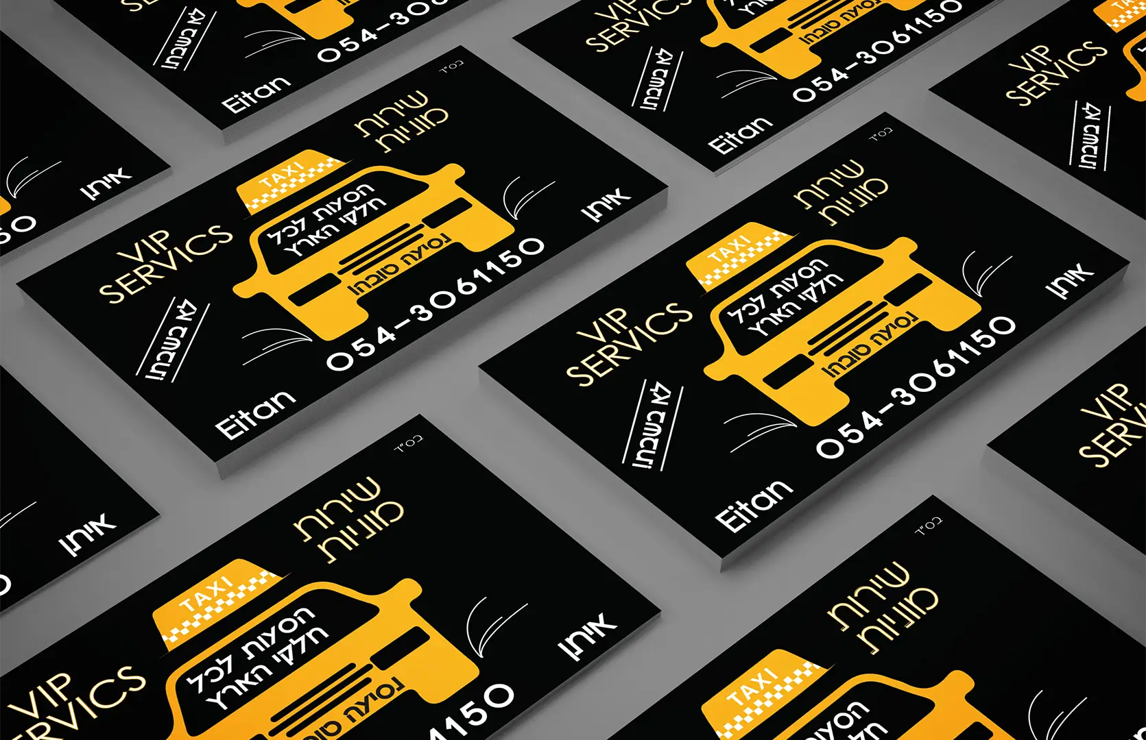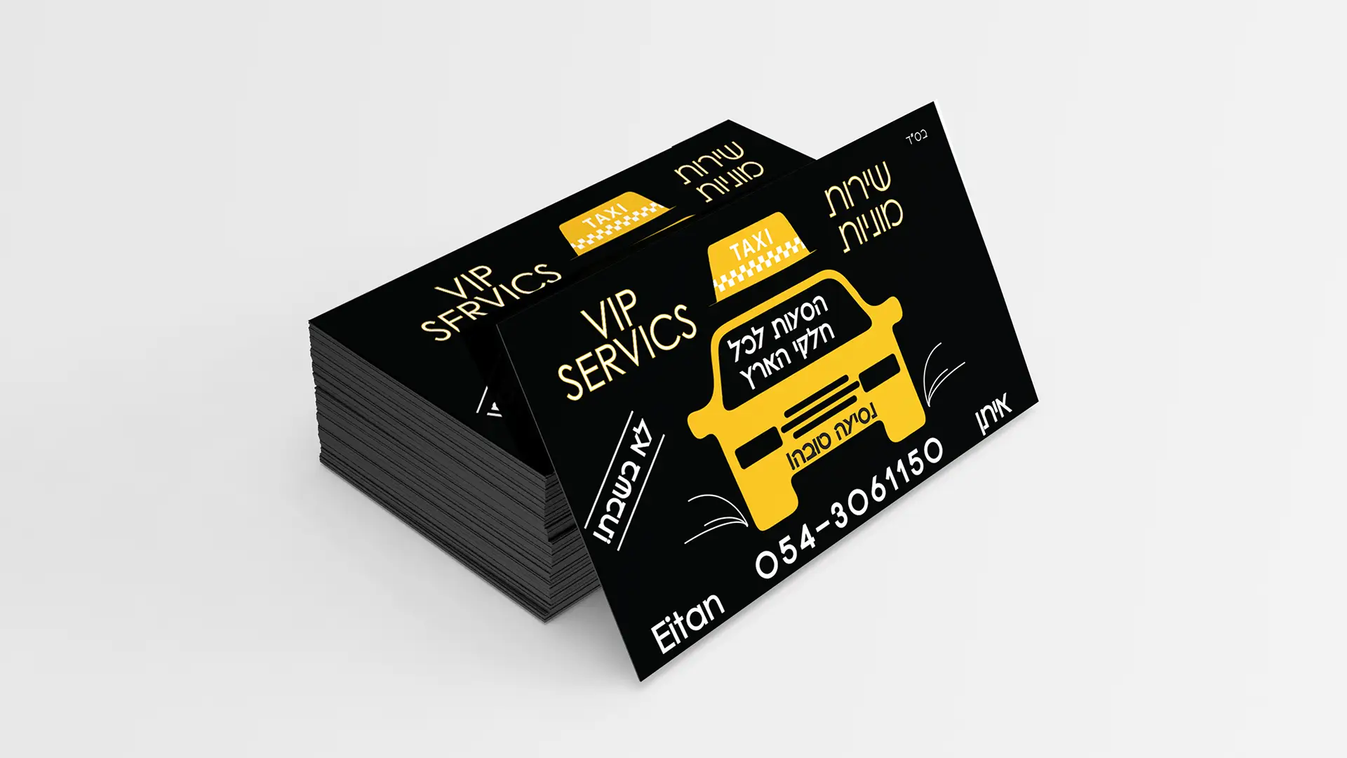 זהו כרטיס ביקור שעיצבתי עבור שירות מוניות VIP, והוא תוכנן לשדר מהירות, אמינות ויוקרה. בחרתי בפלטת צבעים דרמטית של שחור וצהוב חזק, המייצגת את צבעי המונית ויוצרת קונטרסט עוצמתי הבולט לעין. הכרטיס עוצב עם איור בולט של מונית ופונט חותך ואנרגטי, כאשר המידע החיוני מודגש. המסר המרכזי מוצב בצורה חזותית בולטת וחותכת. העיצוב כולו נועד להבטיח שירות אמין ומקצועי, ולשדר את המסר שזוהי ההבטחה לנסיעה הטובה ביותר.