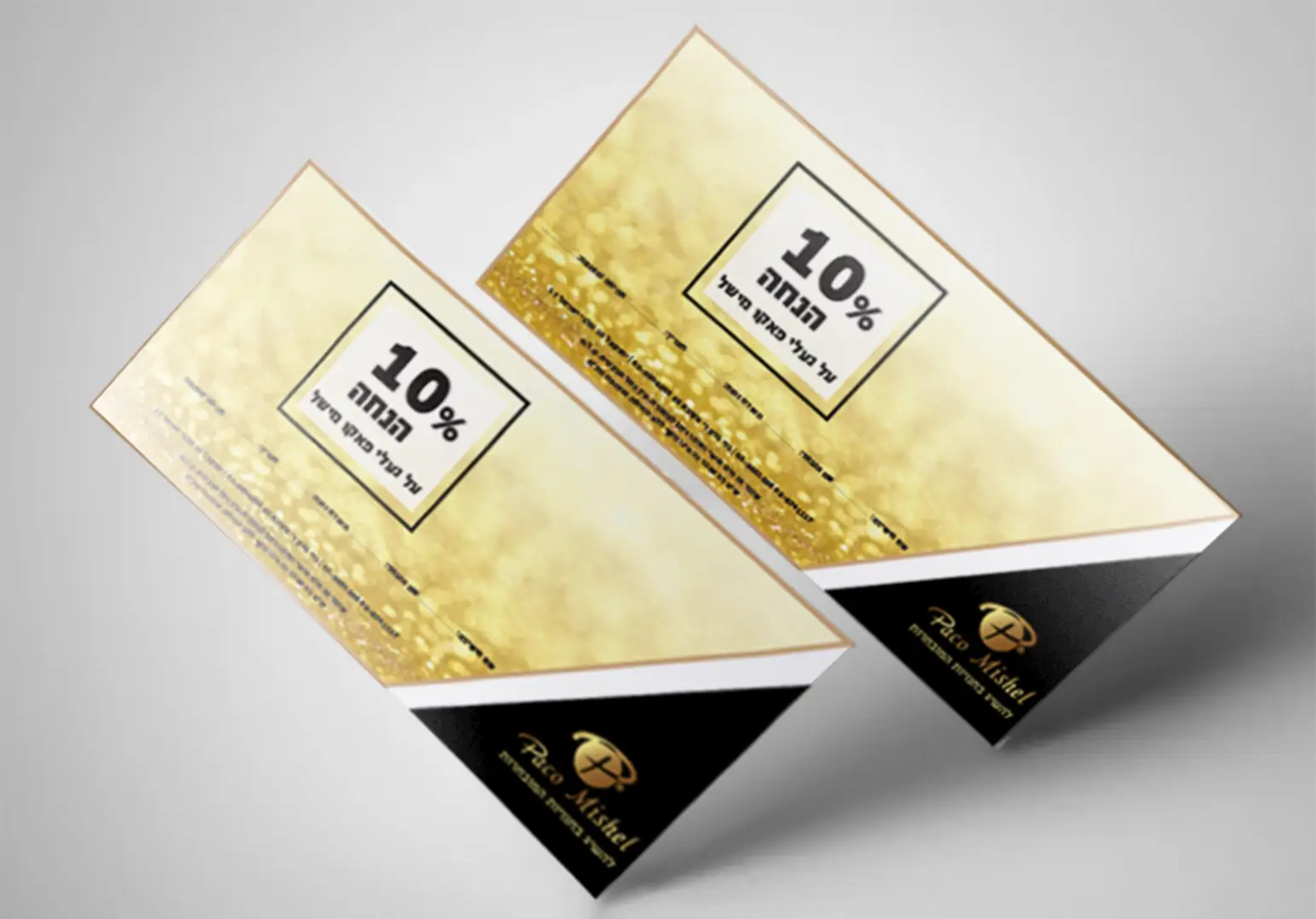זהו עיצוב של שובר הנחה שיצרתי עבור 'Paco Mishel' – מותג הנעלה, והוא נועד לשדר יוקרה, אקסקלוסיביות וקריאה לפעולה מיידית. בחרתי בפלטת צבעים דרמטית של שחור וזהב מנצנץ, שיוצרת מראה יוקרתי וחגיגי. העיצוב משלב טקסטורת נצנצים עשירה וקווי חלוקה גאומטריים, כשההנחה (10%) מודגשת במרכז. הכל נועד לפתות את הלקוח לנצל את ההטבה ללא דיחוי וליהנות מחוויית קנייה יוקרתית.